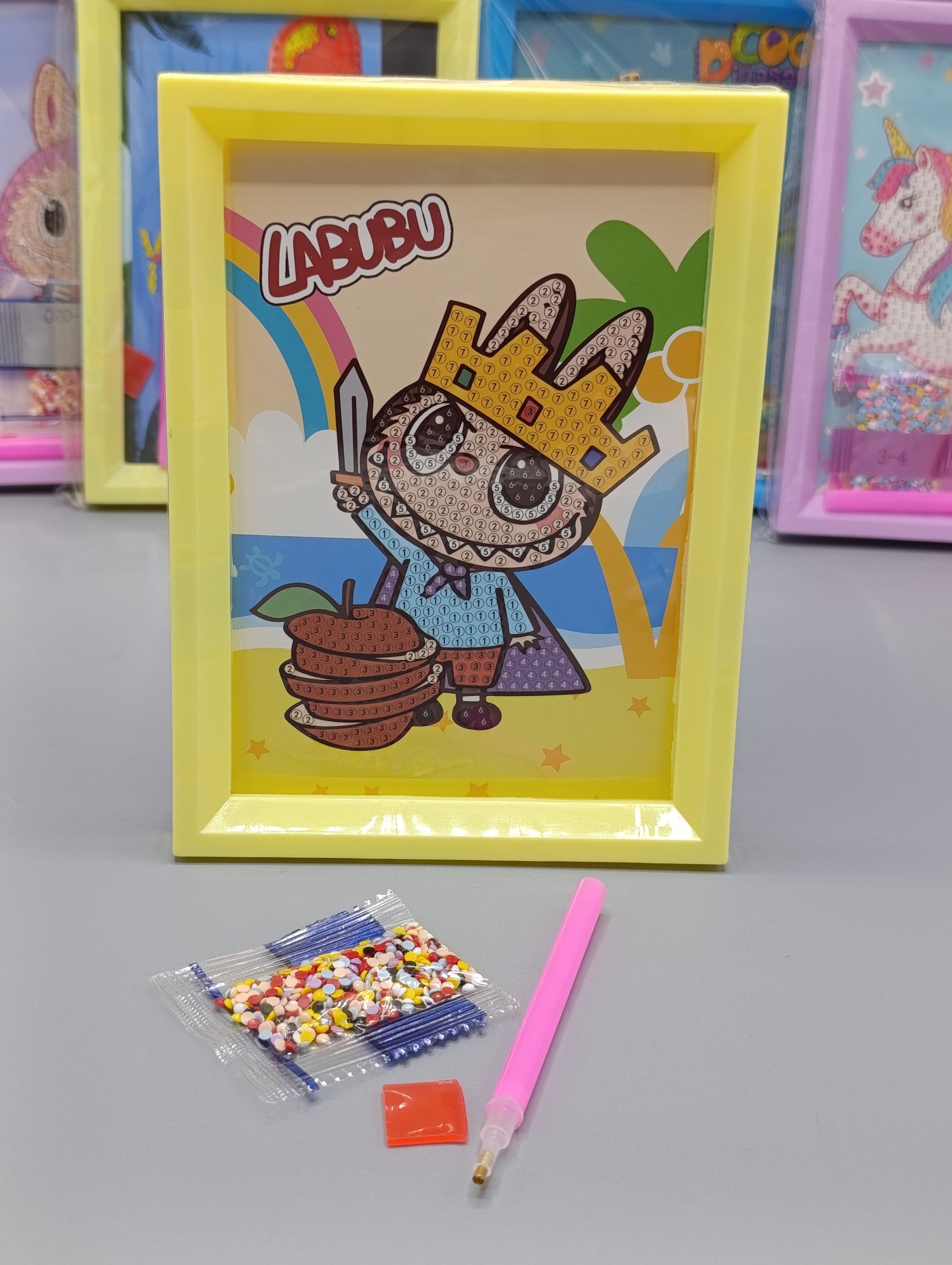 This adorable diamond painting comes in a durable plastic frame and features cute cartoon characters that kids will love! 🧒👧
