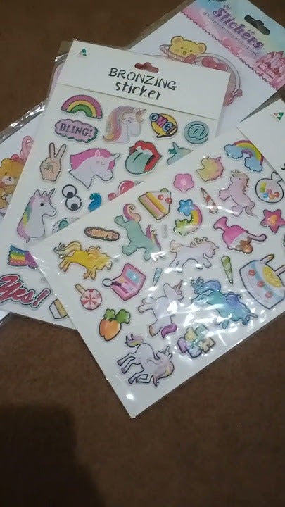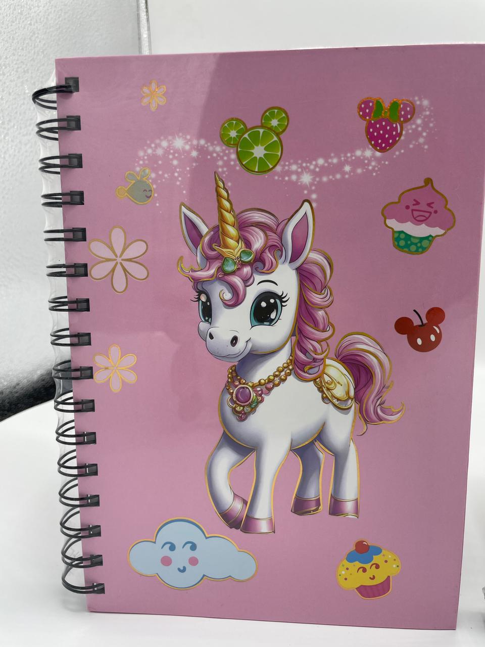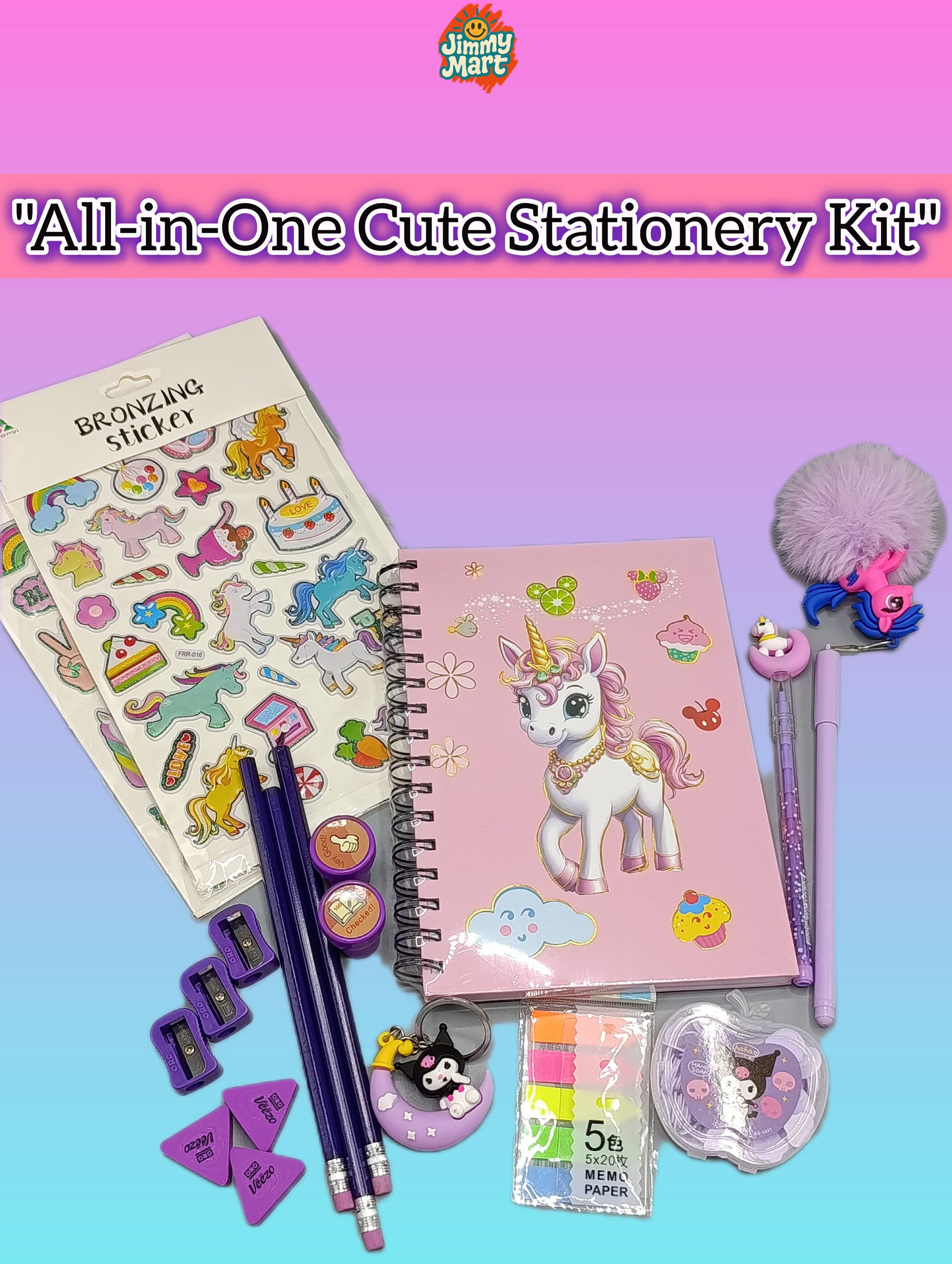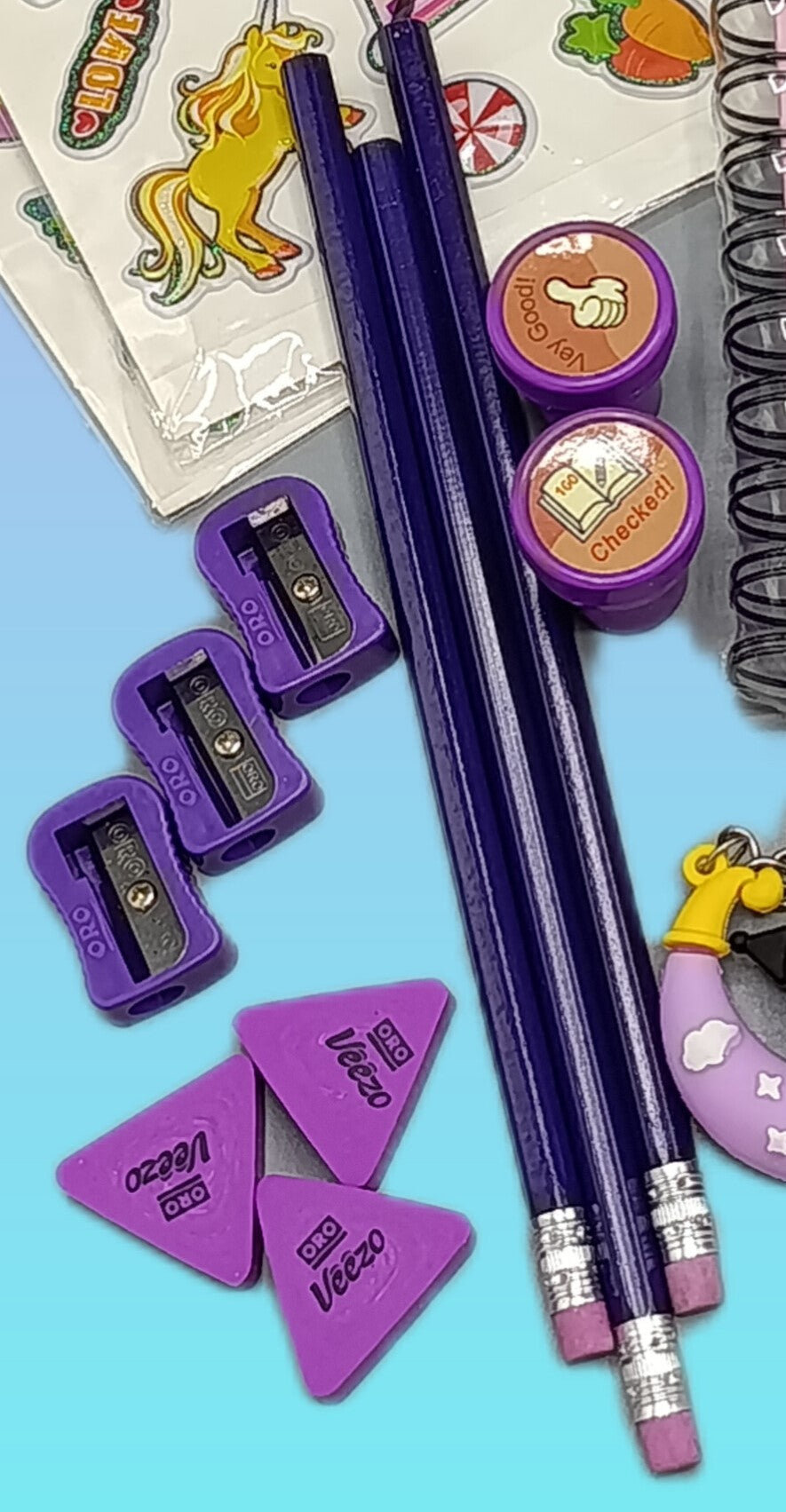 All-in-one kit with 2 stickers, 3 pencils, key chain, unicorn pen, pencil, unicorn diary, 2 stamps, 3 sharpeners, 3 erasers, sticky note, and paper soap