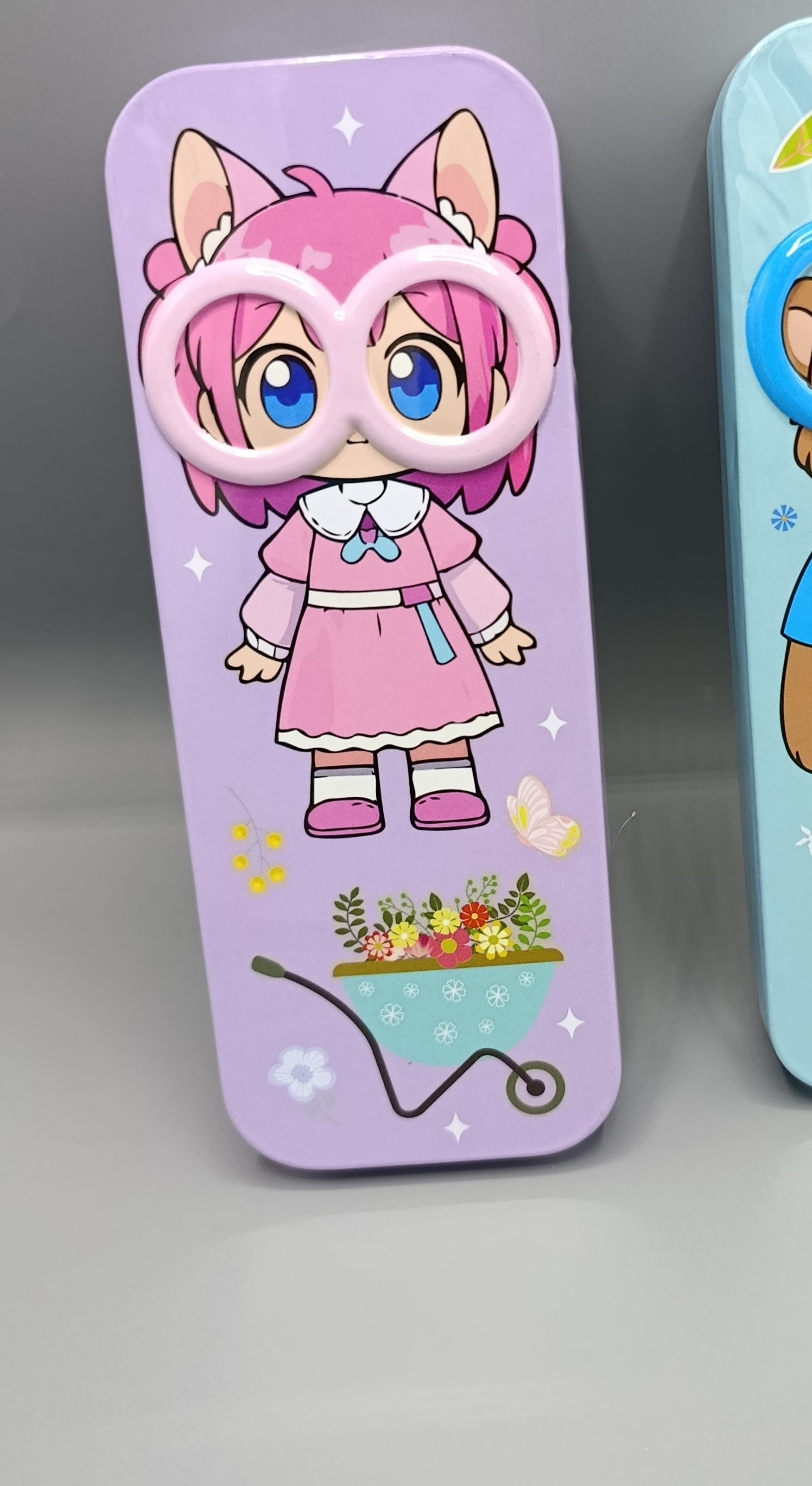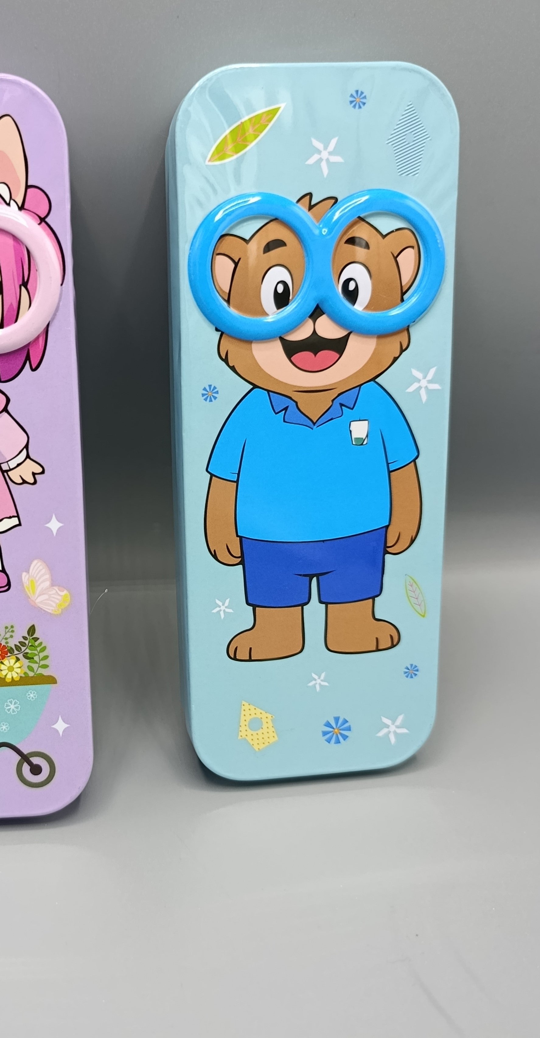 This metal geometry box features fun car, bear, doll, and ice cream characters on its surface. It has two separate compartments and a central tray to organize stationery items neatly